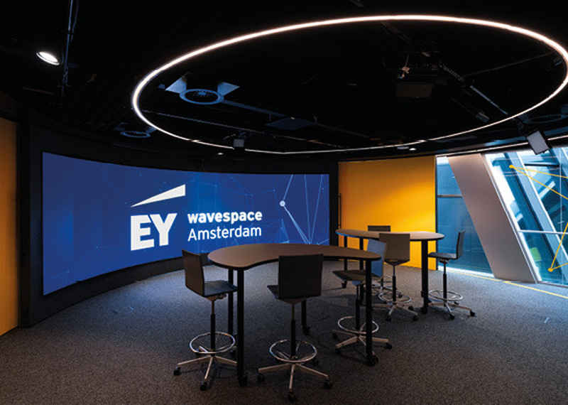 Dankzij de nauwe samenwerking tussen Techit, Hikvision en Output beschikt EY wavespace Amsterdam nu over:* Hikvision Curved LED-scherm (7,2 meter breed en 2,03 meter hoog)