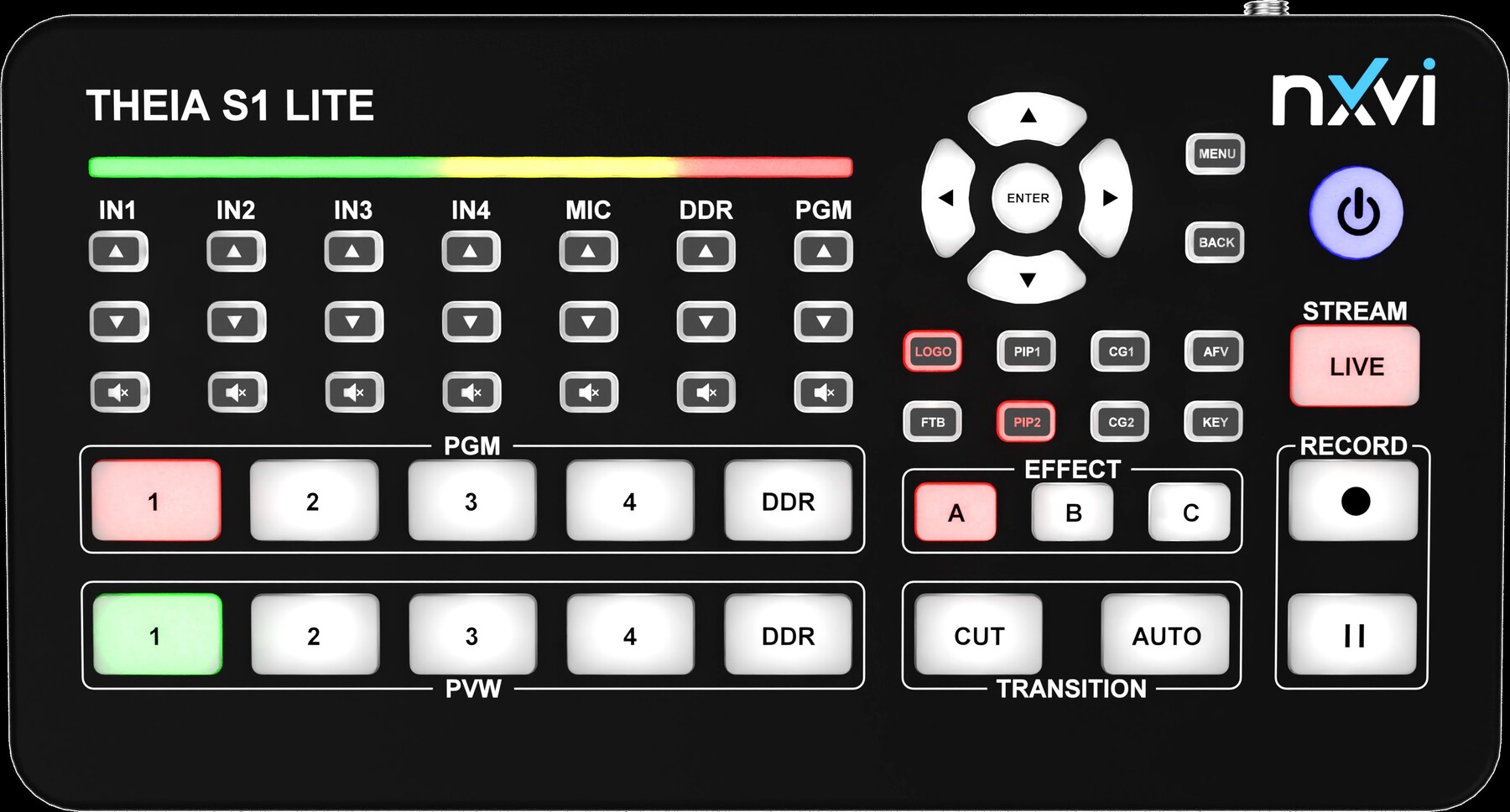 Op audiogebied ondersteunt het systeem meerdere ingangen via HDMI, NDI en netwerk, evenals een analoge stereo-ingang voor externe microfoons. Het apparaat verbruikt minder dan 20 watt, is licht van gewicht en voorzien van een duidelijk verlichte toetsenlay-out voor intuïtieve bediening, ook in donkere omgevingen.